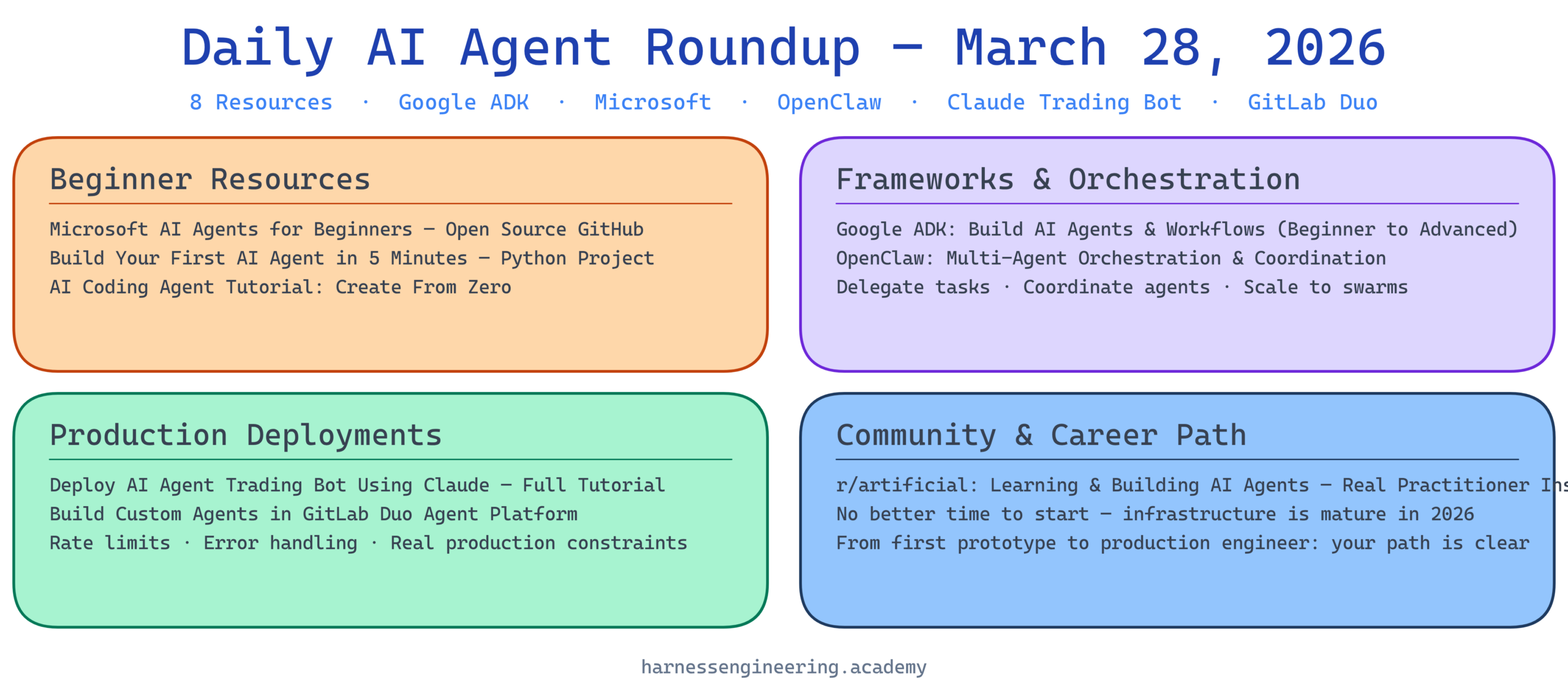 Today’s news tells a clear story: the agent engineering field has matured from “experimental” to “ready for production.” Every major platform—Google, Microsoft, GitLab, Anthropic—is releasing agent frameworks and educational content. What does this mean for you?